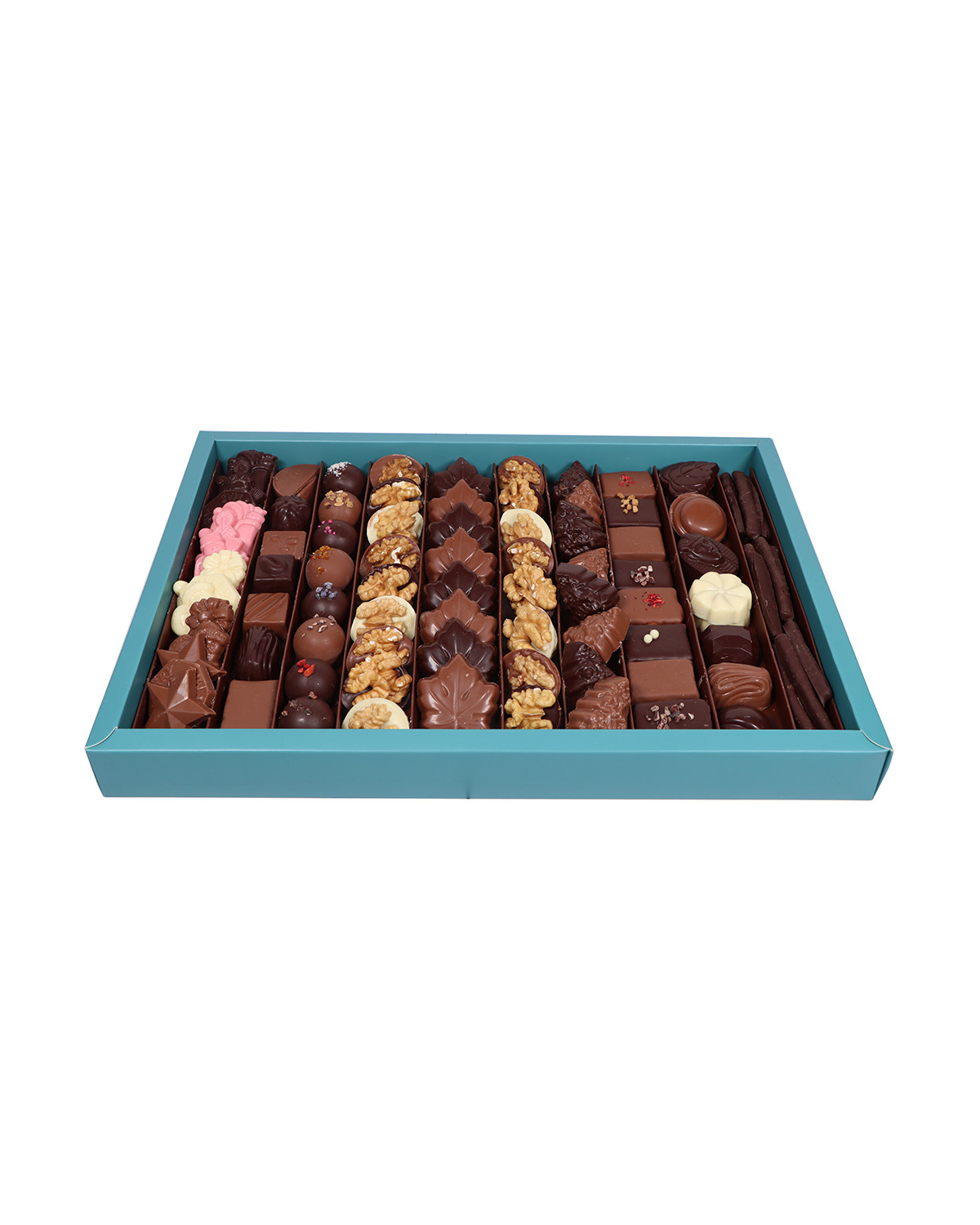 Caixa de bombó de 1000gr assortida de diferents xocolates i sabors. Inclou xocolates amb motius nadalencs.