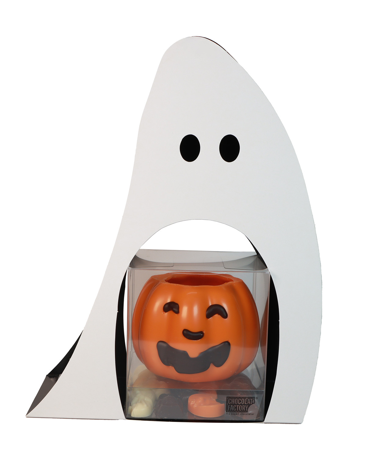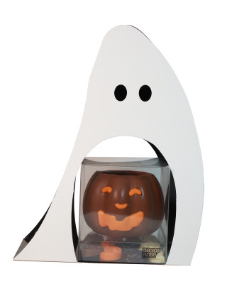 Figura de xocolata amb forma de carbassa. Envolicat amb una carpeta en forma de fantasma.