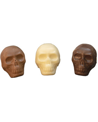 Calavera de xocolata blanca, amb llet , negra i assortiment. Que la teva festa de Halloween sigui terrorífica i irresistible!