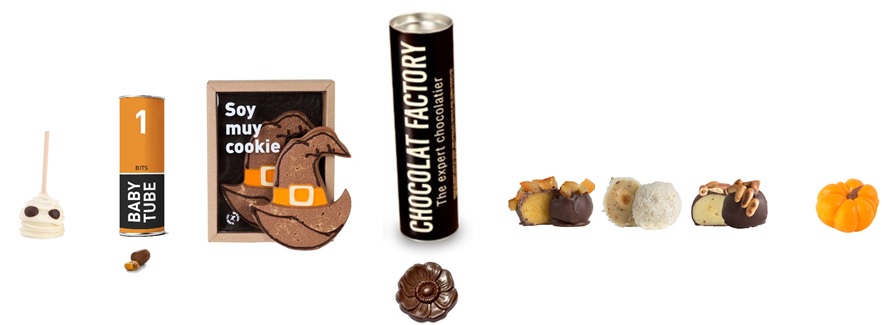 Assortiment de xocolates per a Halloween: bombó carbassa, galeta barret bruixa, chupa chups mòmia, kikos amb xocolata, assortiment de panellets, tub de xocolata negra.