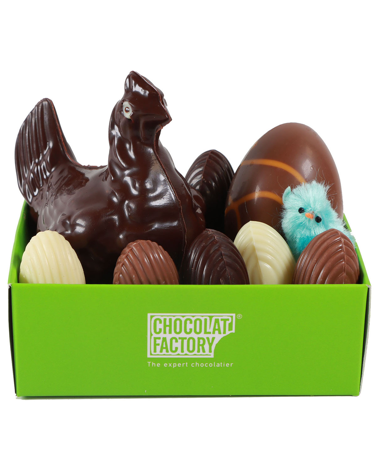 Cistella petita amb figures de xocolata amb motius de pasqua, ous farcits de praliné d'avellanes i encenalls de xocolata.