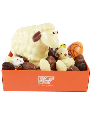 Cistella mitjana amb figures de xocolata amb motius de pasqua, ous farcits de praliné d'avellanes i encenalls de xocolata.
