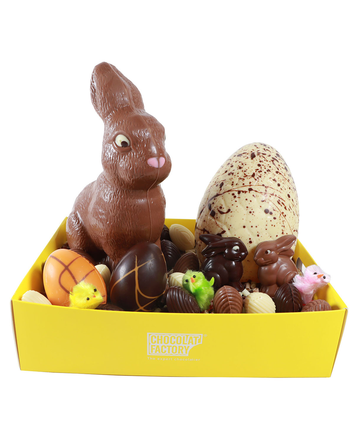 Cistella grossa amb figures de xocolata amb motiu de pascua, ous farctis de praliné d'avellanes i virutes de xocolata.