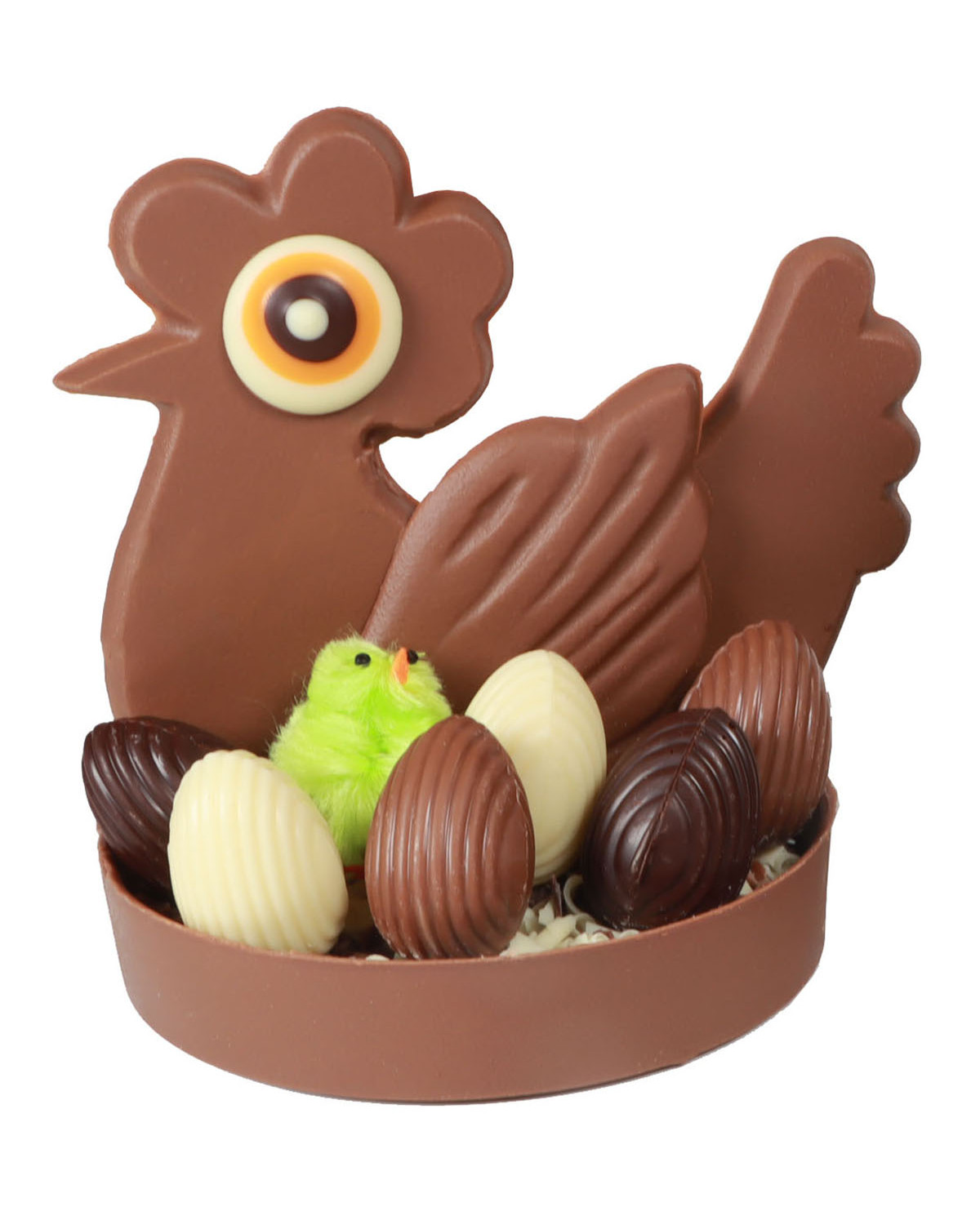 Gallina de pasqua de xocolata amb llet amb encenall i ous farcits de praliné.