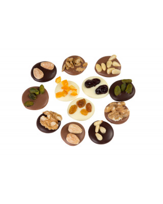 Assortiment de mondiants de xocolata amb llet, negra i blanca, amb fruits secs i cítrics.