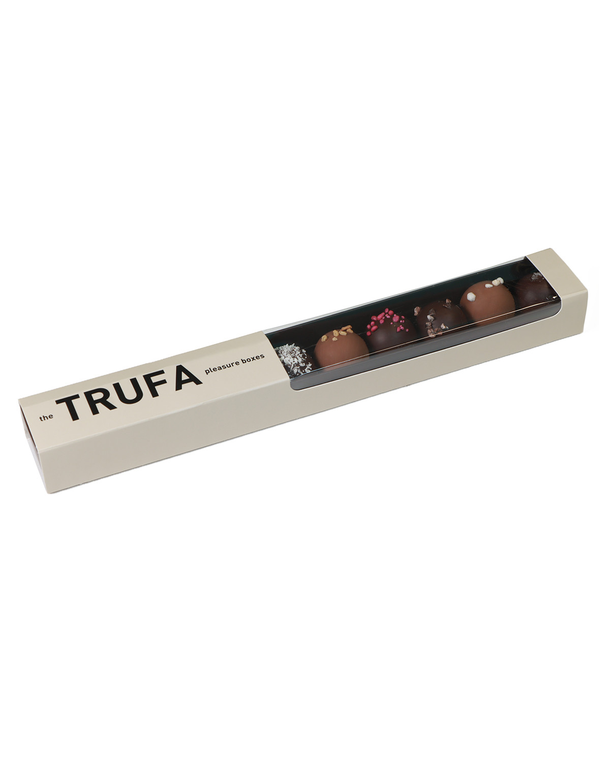 Assortiment de trufes de xocolata sense licór, elaborades en xocolata amb llet: festuc i guianduja, i xocolata negra: coco, vainilla i ametlla, Sao Thomé 70%, Equador 76% ambv sal, Tanzània 75%, Veneçuela 72% i Kumabo amb nibs 80%.