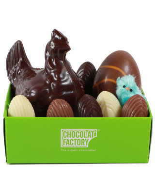 Small basket with chocolate figures with Easter motifs, eggs filled with hazelnut praline and chocolate shavings.