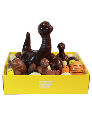 Large basket with chocolate figures with Easter motifs, eggs filled with hazelnut praline and chocolate shavings.