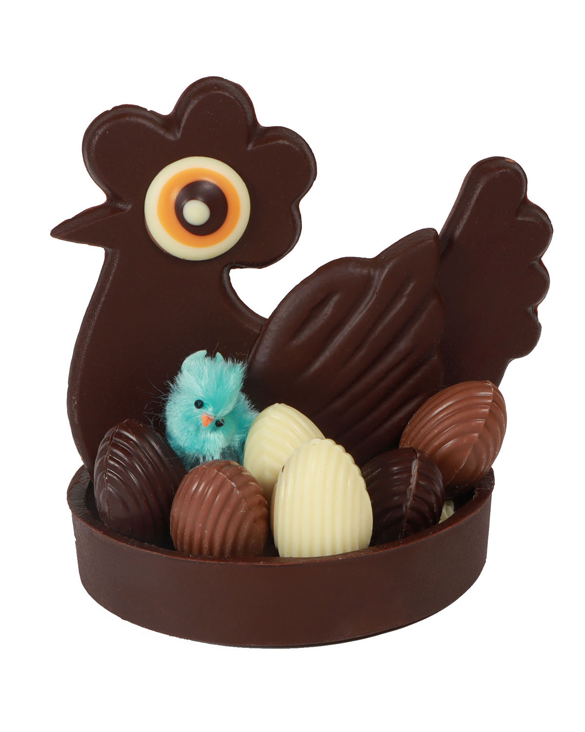 Dark chocolate Easter chicken with shavings and praline-filled eggs.