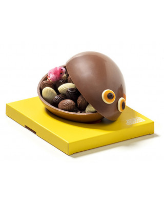 Plenty of eggs. Small Treasure Egg made of milk chocolate with chocolate shavings and eggs filled with hazelnut praline.