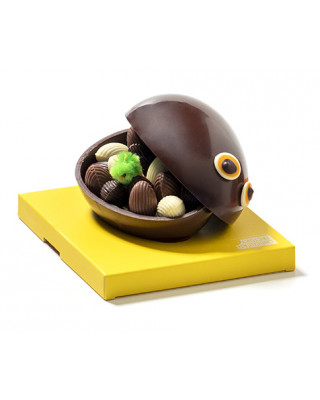 Plenty of eggs. Small Treasure Egg made of milk chocolate with chocolate shavings and eggs filled with hazelnut praline.