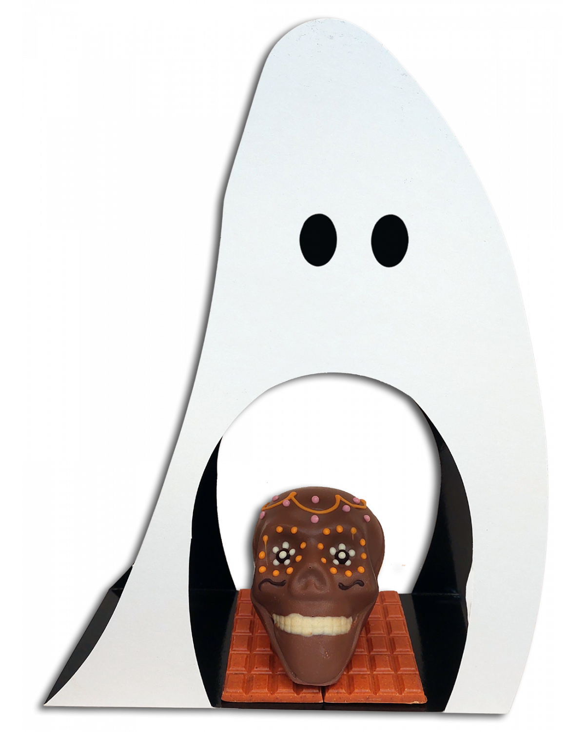Chocolate figure in the shape of a mexican skull. Wrapped in a ghost-shaped folder.