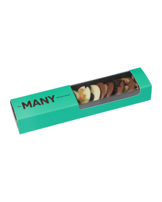 Mondiants assortment of dark, milk and white chocolate, with nuts and citrus.
