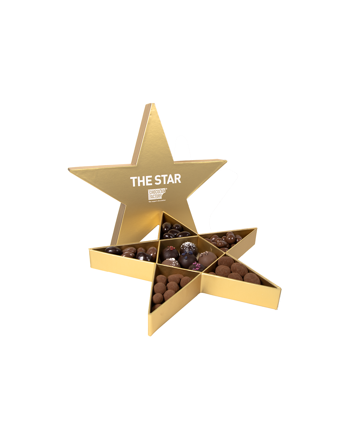 Surtido de bits de chocolate y trufas, en una caja con forma de estrella.