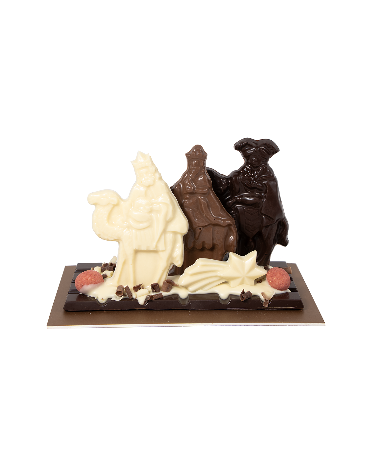 Figuras de Navidad de Reyes Magos, en chocolate con leche, chocolate negro y chocolate blanco.