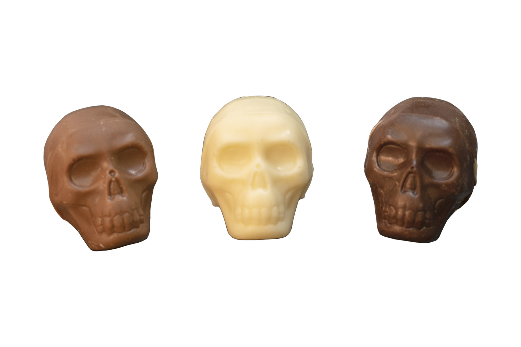 Calavera de chocolate blanco, con leche, negro y surtido. Que tu fiesta de Halloween sea terrorífica e irresistible!