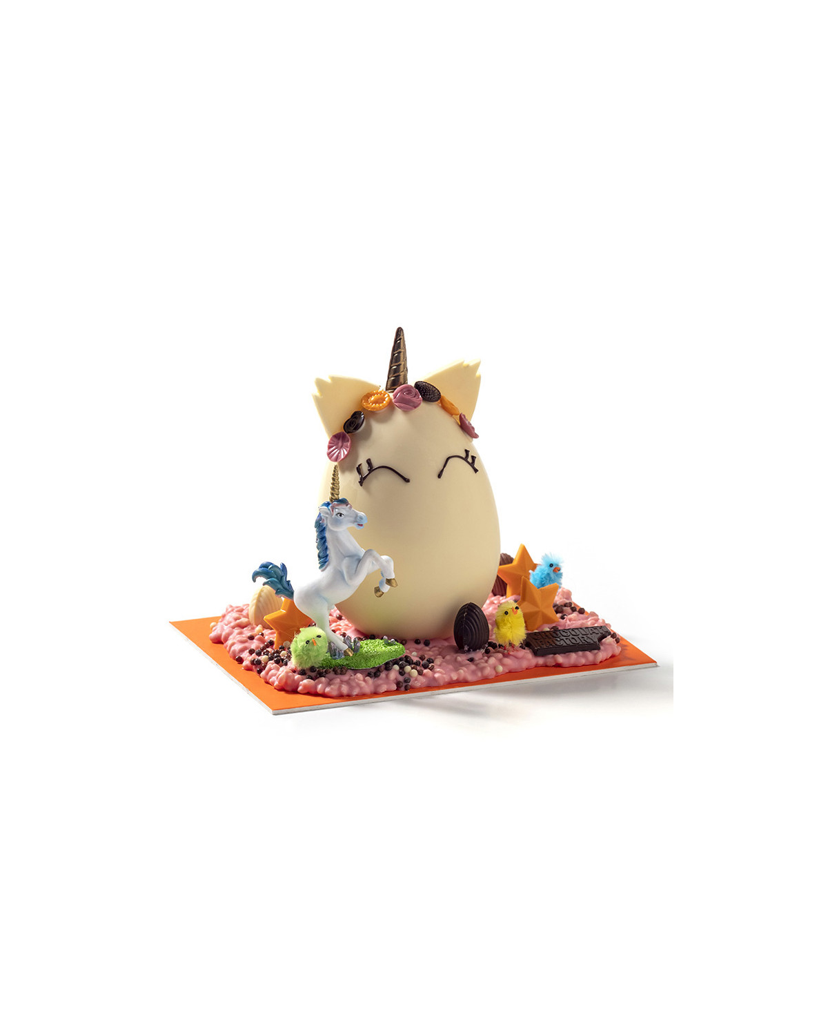 Un huevo de chocolate blanco simulando a un unicornio, con detalles en chocolate con sabor a fresa y naranja, sobre una base crujiente de chocolate con fresa y arroz inflado y huevos de praliné de avellana.
