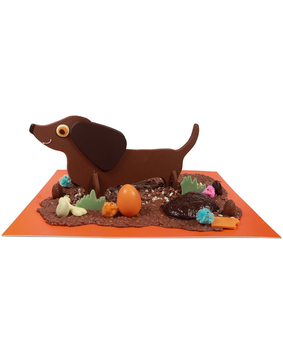 Mona de Pascua. Perro salchicha elaborado en chocolate con leche, con varios detalles en chocolate negro, blanco y con sabor a naranja, sobre una base crujiente de chocolate con leche y arroz inflado, decorado con huevos de praliné de avellana.