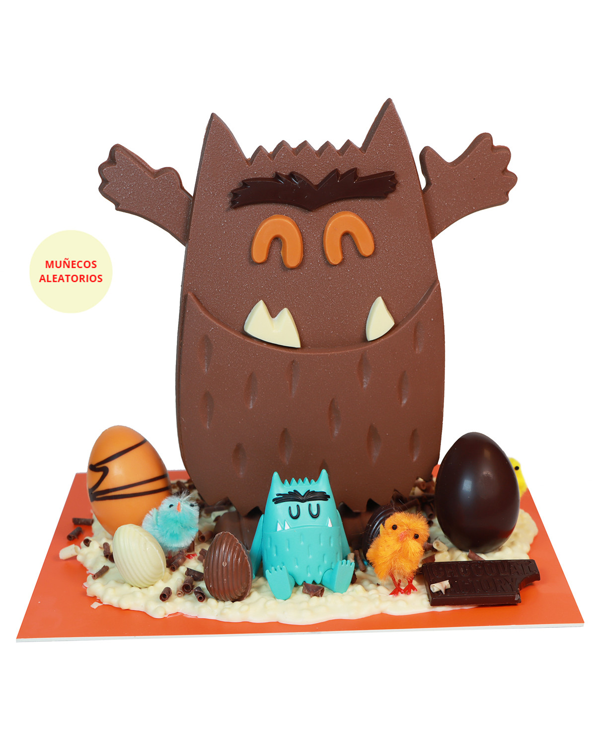 Monstruosamente dulce. Monstruo elaborado en chocolate con leche y varios detalles en chocolate blanco, negro y con sabor a naranja sobre una base crujiente de chocolate blanco con arroz inflado, decorado con varios huevos de praliné de avellana.