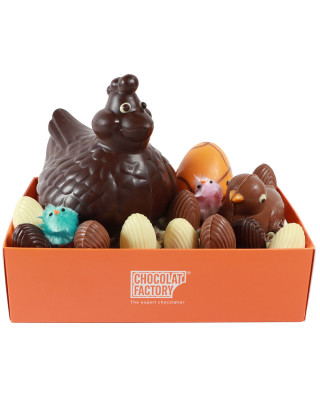Cestito mediano con figuras de chocolate con motivos de pascua, huevos rellenos de praliné de avellanas y virutas de chocolate.