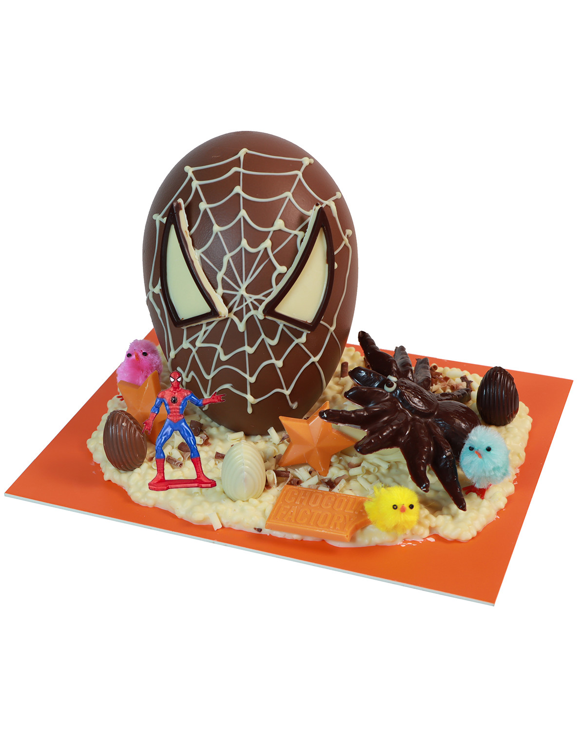 Figura de chocolate con leche con detalles en chocolate blanco, chocolate negro y chocolate sabor a naranja sobre una base de chocolate blanco y arroz inflado decorada con huevos de praliné de avellanas.