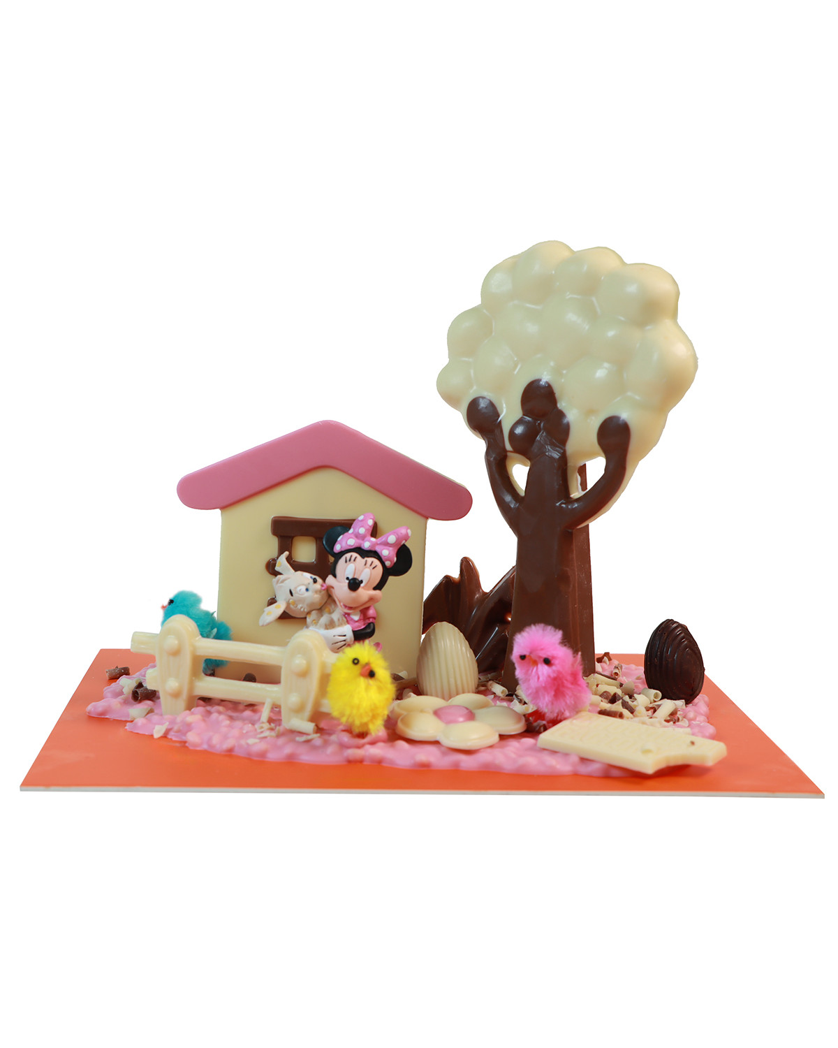 Figura de chocolate blanco con detalles en chocolate con leche y chocolate sabor fresa sobre una base de chocolate sabor fresa con arroz inflado decorada con huevos de praliné de avellanas.