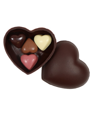 Corazón de chocolate negro donde en su interior encontrarás bombones de chocolate negro, chocolate con leche y chocolate blanco rellenos de praliné de avellanas, y chocolate ruby relleno de fresa.