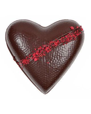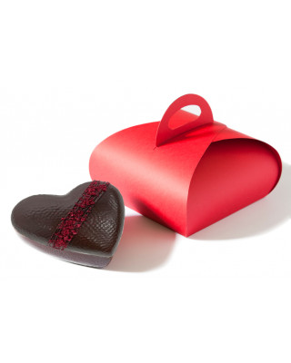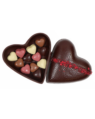Corazón de chocolate de chocolate negro o chocolate con leche donde en su interior encontrarás bombones de chocolate negro, chocolate con leche y chocolate negro rellenos de praliné de avellanas y bombón de cobertura Ruby relleno de fresa.