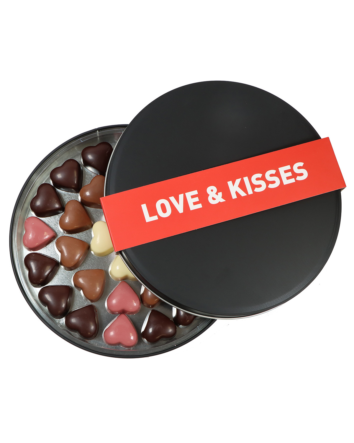 Surtido de bombones de San Valentín rellenos de praliné de avellana en chocolate negro, chocolate con leche y chocolate blanco y bombón de chocolate Ruby relleno de frambuesa.