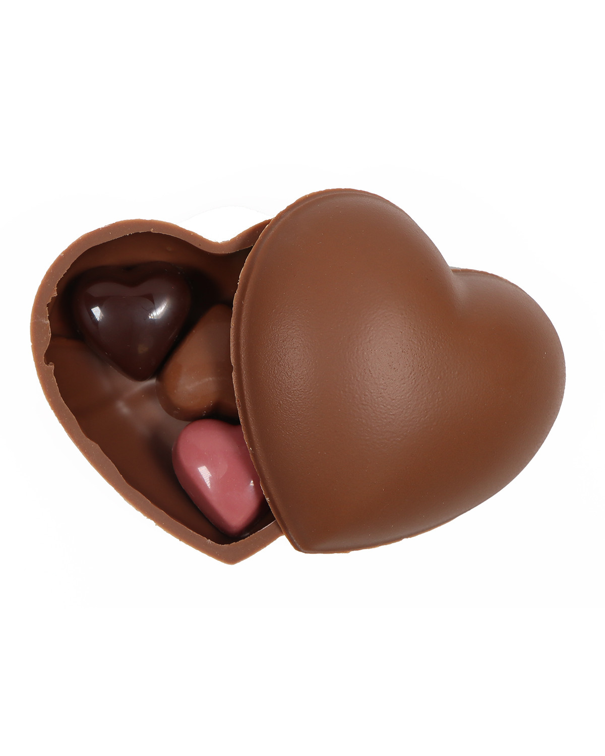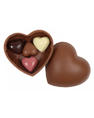Corazón de chocolate con leche donde en su interior encontrarás bombones de chocolate negro, chocolate con leche y chocolate blanco rellenos de praliné de avellanas, y chocolate ruby relleno de fresa.