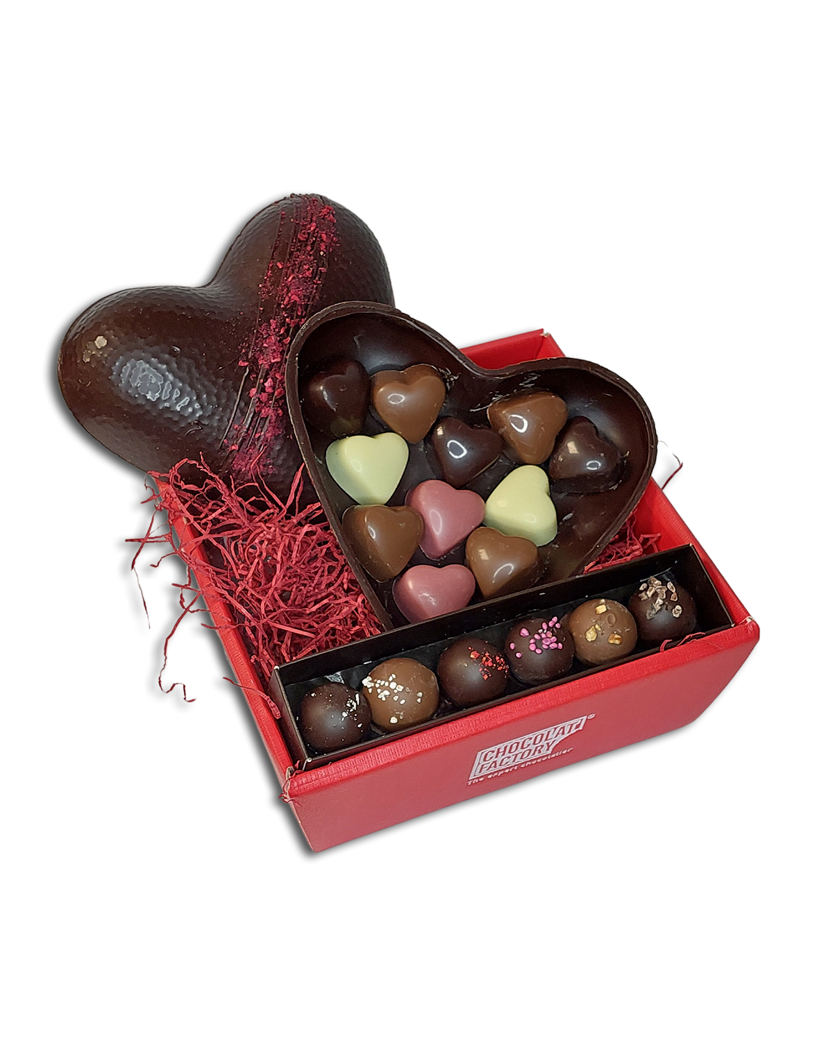 - Corazón negro o leche relleno de bombones de corazón negro, leche y blanco con praliné y bombón de Ruby con fresa.